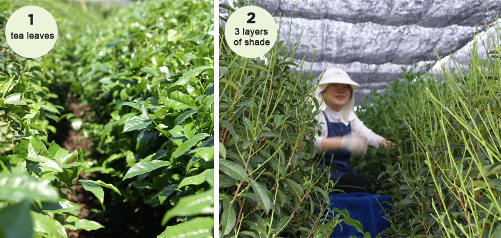 Matcha green tea bushes are grown under lots of shade (the big black shades you can see at the top of image 2). This boosts the chlorophyll content in the leaves (that’s the bright green stuff that contains all the nutrients).